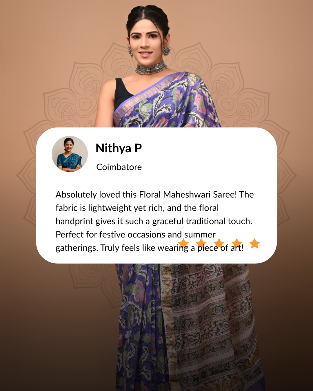 Every saree and suit is handcrafted using natural dyes and traditional wooden blocks. 100% genuine Bagru prints.