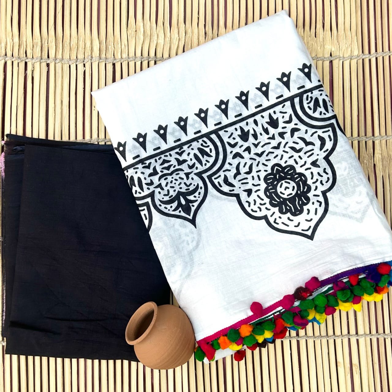 Our Malmal Saree collection showcases authentic craftsmanship from Bagru, Jaipur. Each piece is carefully handcrafted using time-honored techniques. The mandala print design in white color adds uniqueness and charm. pompom lace